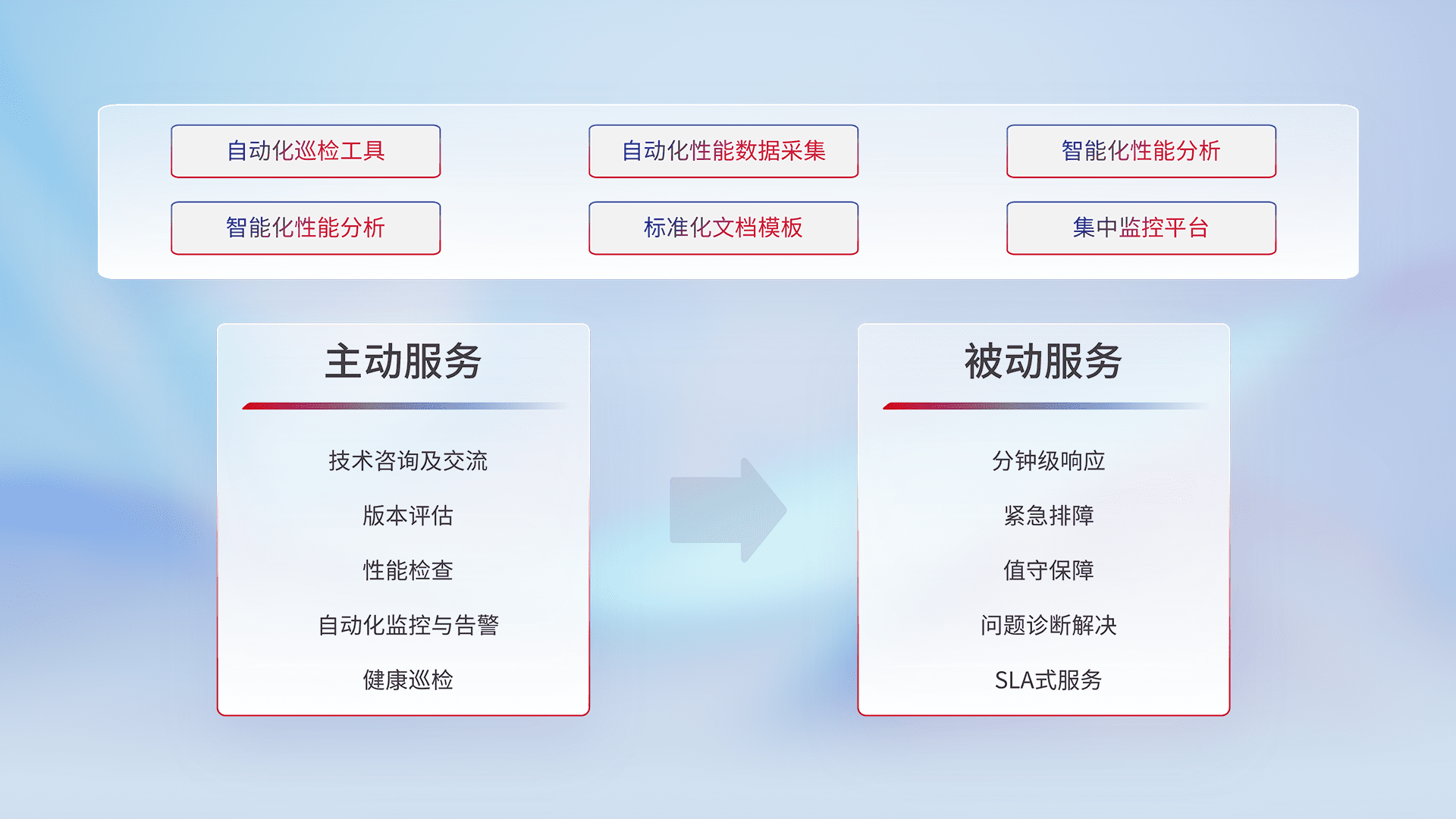 智能化工具和标准化文档,,,保障服务质量,,提供主动服务(包含技术咨询、、、版本评估、、、、性能检查、、、、自动化监控与告警、、健康巡检)和被动服务包含(分钟级响应、、、紧急排障、、值守保障、、、问题诊断解决、、SLA服务)。。。